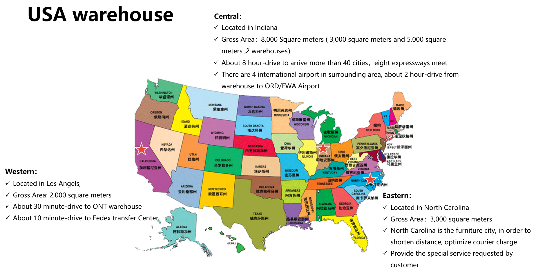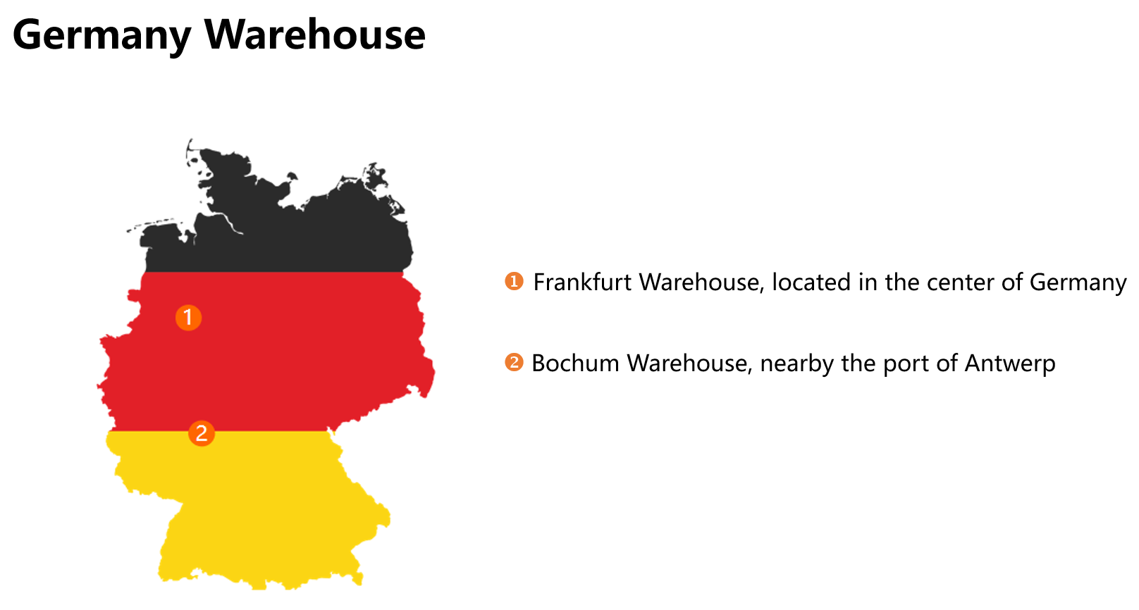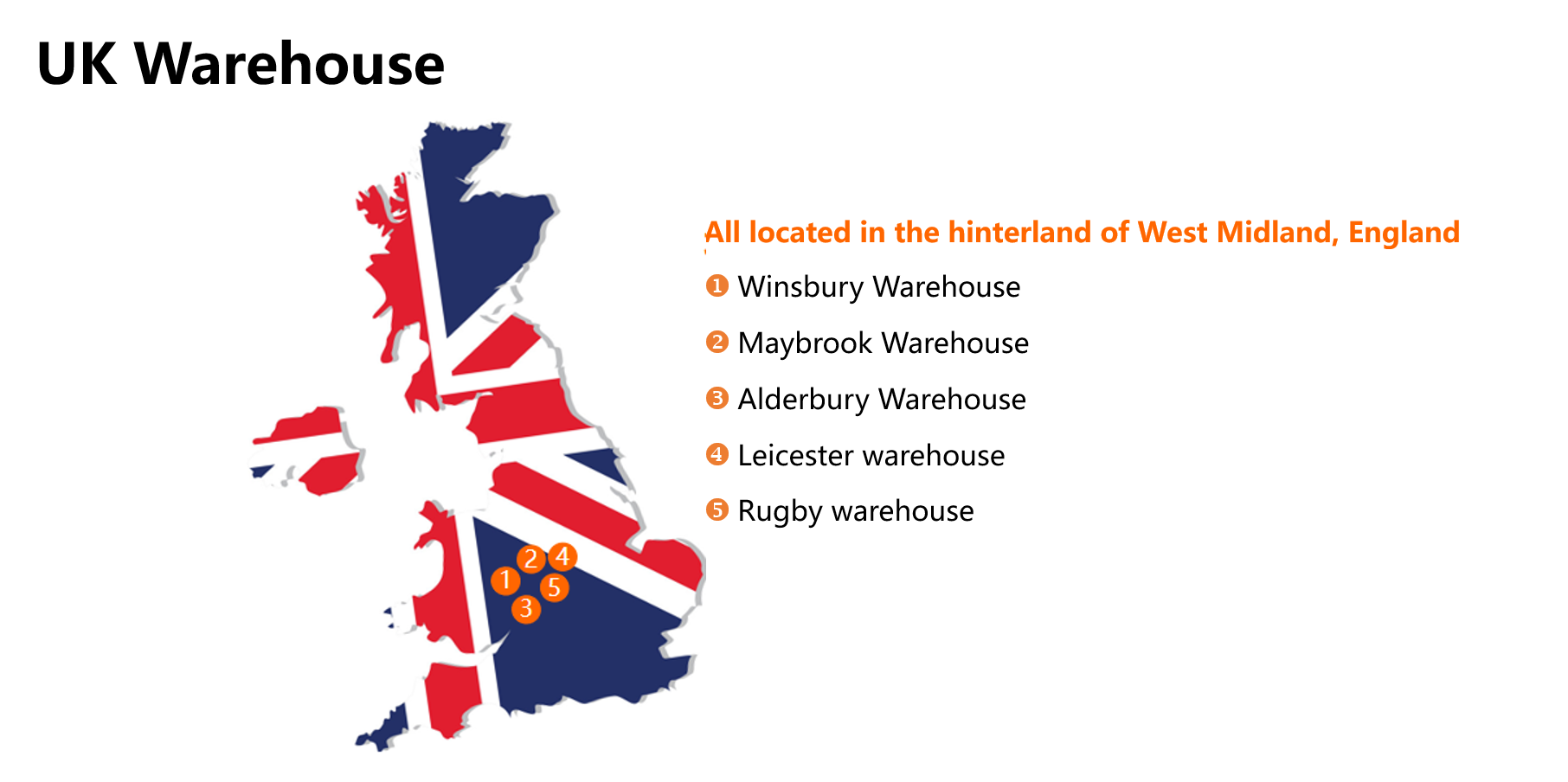 Located in European and American countries (the United States, the United Kingdom, Germany), we provide customized overseas warehouse management solutions for leading e-commerce enterprises. Services include one-stop shipping, cargo transfer, label application and replacement, return and repair, warehouse storage, and disposal. In the UK and Germany, there are 7 warehouse distribution centers, with a total warehouse area exceeding 60,000 square meters. These centers can handle the storage and delivery of large and battery-related goods.